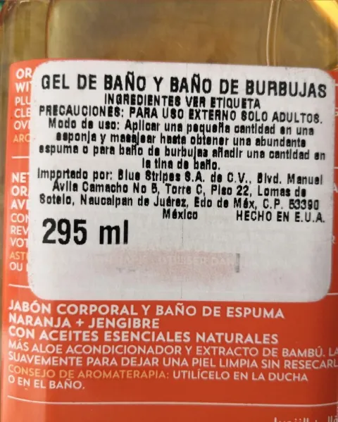 Jabón corporal más baño de espuma de naranja y gengibre con aceites esenciales naturales más aloe acondicionador y estracto de bambú. Deja una piel limpia. Hecho en USA. 295 ML. Te encantará 😉⚜️👌🥛