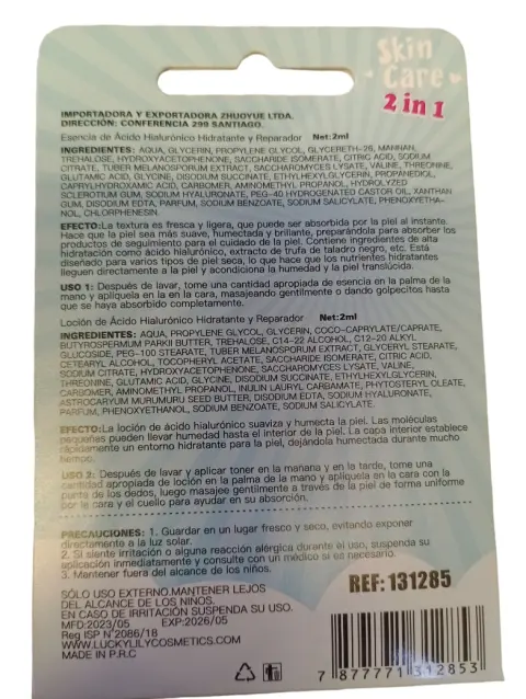 Esencia de ácido hialurónico. ESENCIA Y LOCIÓN DE ÁCIDO HIALURÓNICO HIDRATANTE Y REPARADORCADA PAQUETE CONTIENE 2 PRODUCTOS, 1 ESENCIA Y 1 LOCIÓN.1. SOBRE LA ESENCIA:La textura es fresca y ligera, que puede ser absorbida por la piel al instante. Hace que la piel sea más suave, humectada y brillante, preparándola para absorber los productos de seguimiento para el cuidado de la piel. Contiene ingredientes de alta hidratación como el ácido hialurónico, extracto de trufa de taladro negro, etc. Está diseñado para varios tipos de piel seca, lo que hace que los nutrientes hidratantes lleguen directamente a la piel y acondiciona la humedad y la piel traslúcida.Uso de la esencia:Después de lavar, tome una cantidad apropiada de esencia en la palma de la mano y aplíquela en la cara, masajeando gentilmente o dando golpecitos hasta que se haya absorbido completamente.2. SOBRE LA LOCÍON:Suaviza y humecta la piel. Las moléculas pequeñas pueden llevar humedad hasta el interior de la piel. La capa interior establece rápidamente un entorno hidratante para la piel, dejándola humectada durante mucho tiempo.Uso de la loción:Después de lavar y aplicar la esencia en la mañana y en la tarde, tome una cantidad apropiada de loción en la pala de la mano y aplíquela en la cara con la punta de los dedos, luego masajee gentilmente a través de la piel de forma uniforme por la cara y el cuello para ayudar en su absorción.PRECAUCIONES:1. Guardar en un lugar fresco y seco, evitando exponer directamente a la luz solar.2. si siente irritación o alguna reacción alérgica durante el uso, suspenda su aplicación inmediatamente y consulte con un médico si es necesario.3. Mantener fuera del alcance de los niños.