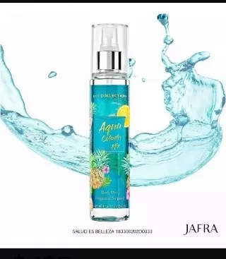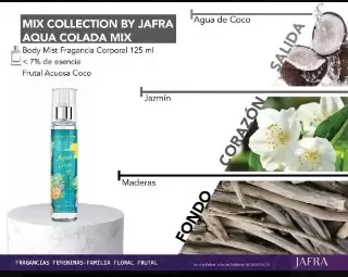 Fragancia Jafra. Perfume Aqua Colada Mix para dama, "esencia aromática Flores y frutal piña, limón, coco" para el cuerpo.Contenido 125 ml
