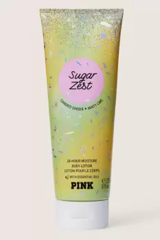 Pink Loción corporal Sugar Zest. Una mezcla efervescente de lima y menta que se realza con jengibre azucarado. Estilo: frescura frutal. Con notas de lima y menta y jengibre azucarado.236 ml/8 oz líq.Producto original/nuevo