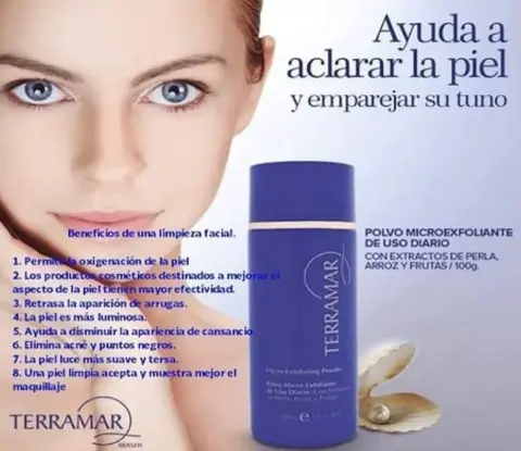 Polvo micro exfoliante de uso diario. Ayuda aclarar la piel y emparejar tu tono es de uso diario con extractos de perla, arroz y frutas