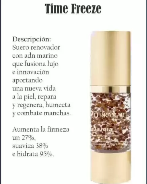 TIME FREEZE es un suero que fusiona lujo e innovación al combinar activos marinos que aportarán una nueva vida a tu piel. 😊¿Ya lo probaste?𝑻𝑰𝑴𝑬 𝑭𝑹𝑬𝑬𝒁𝑬 𝑺𝑬𝑹𝑼𝑴 𝑻𝑬𝑹𝑹𝑨𝑴𝑨𝑹 es un producto orgánico elaborado con ADN marino, células madre de algas y extracto de caviar en esferas, entre otros.¿ℚ𝕦é 𝕙𝕒𝕔𝕖?💦Repara y regenera la piel💦Humecta intensamente💦Combate Manchas💦Ayuda a aumentar la firmeza en la piel del rostro💦Da luminosidad💦Mejora el tono y elasticidad¡Olvidate de las demás cremas! con este nuevo TIME FREEZE SERUM.*ℂ𝔼𝕃𝕌𝕃𝔸𝕊 𝕄𝔸𝔻ℝ𝔼 𝔻𝔼 𝔸𝔻ℕ 𝕄𝔸ℝ𝕀ℕ𝕆 𝕐 ℂ𝔸𝕍𝕀𝔸ℝ*SOLO 2 proveedores en el mundo, de este extracto maravilloso, incrementa el número de células y estimulan la producción de colágeno y otros beneficios antioxidantes para la piel flacida en conjunto con un masaje Facial reafirmante, recuperas la firmeza de la piel entre 21 y 28 días lo que tardan las células en regenerarse. En SUIZA una inyección 💉 cuesta aproximadamente $10,000 usd, #TERRAMAR tiene el mismo activo en nuestro exquisito suero Time Frezze. ✨✨Testimonios reales de los resultados que dan nuestros productos anímate a probar los resultados son increíbles.✨✨