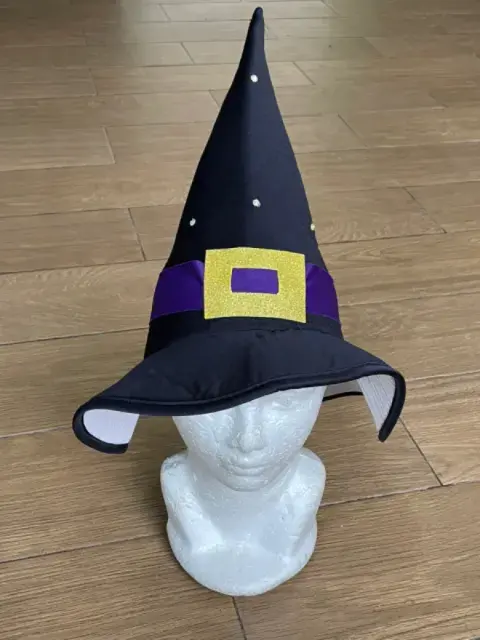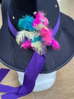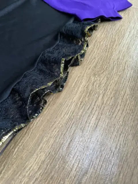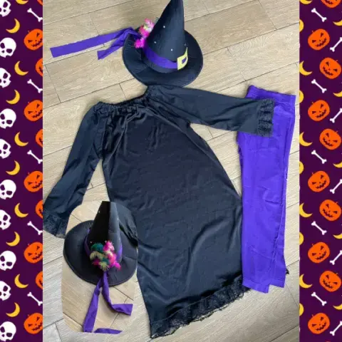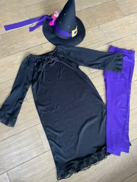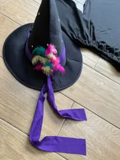Disfraz bruja talla Ch/M. 🎃🎃🎃🧙🏻♀️Traje talla Ch / M negro no es tela satinada cuenta con sombrero con plumas y mayon morado para acompañarlo con botas negras o zapato negro flats o alto
