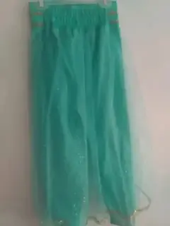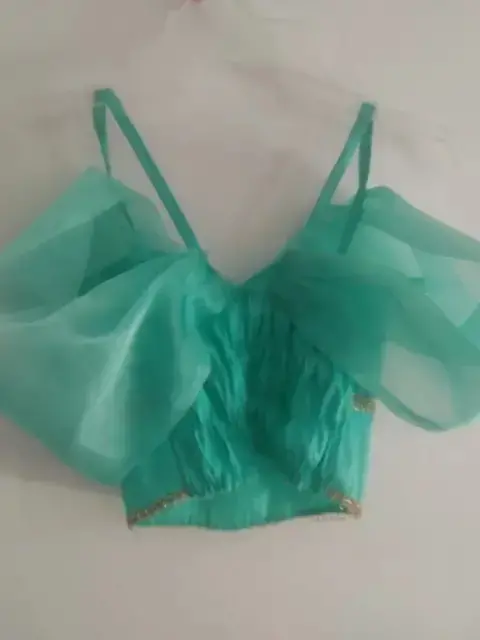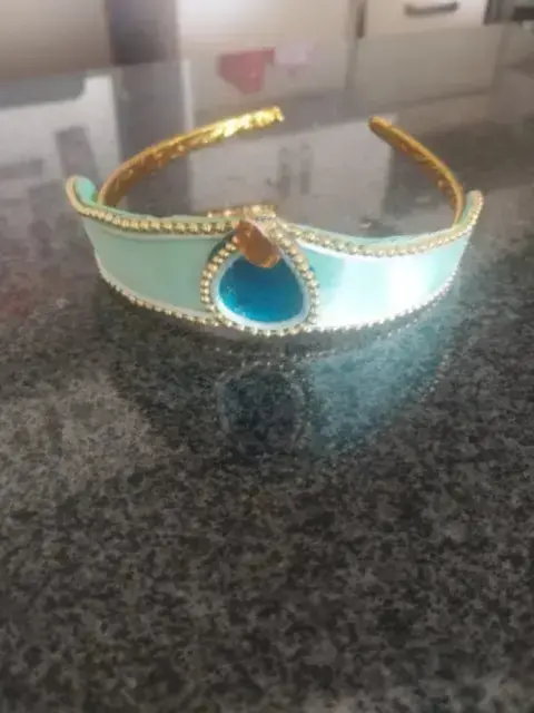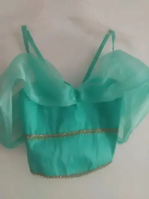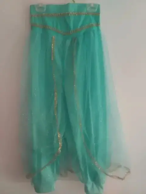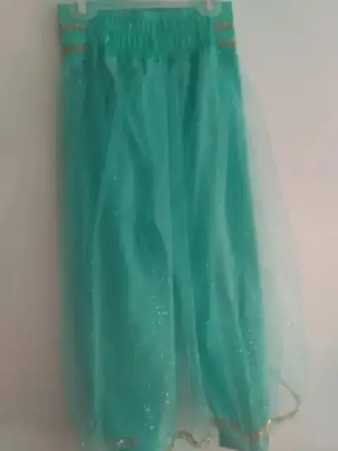Disfraz Jazmín niña talla 8-10. Pantalón y blusa color turquesa con detalles en dorado . Incluye diadema . Elástica en la cintura .