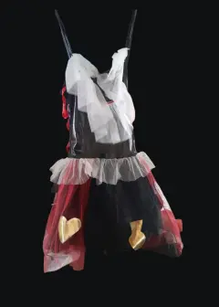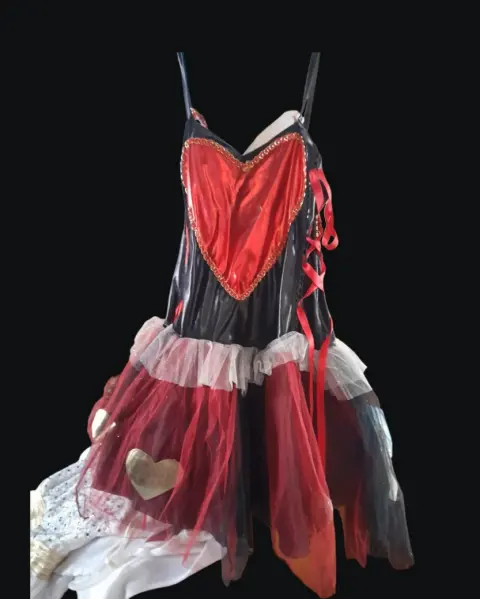 Disfraz reina corazónes. Vestido en razo, tirantes, talla 10, con vuelo en tul