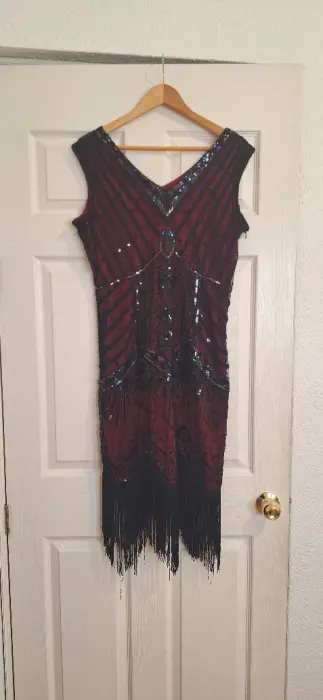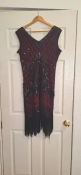 The Great Gatsby. Vestido años 20 estilo flapper en color vino y negro. Tiene guantes negros largos para completar el look.