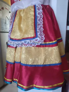 Hermoso vestido con excelente calidad en su hechura, color rojo con amarillo y vivos azules con detalles en el pecho de encaje y lentejuela tono azul turquesa talla 8