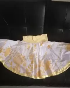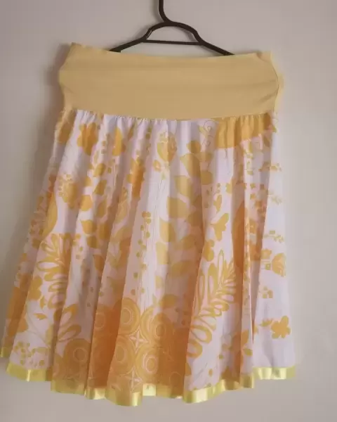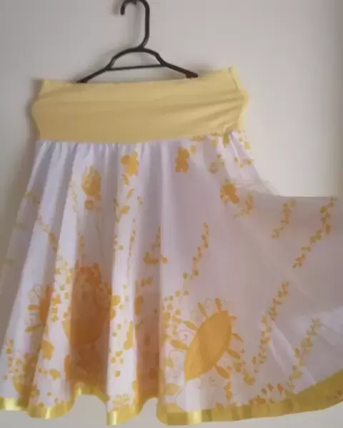 Falda sueltaColor: blanco con amarilloTalla: UnitallaMedidas: *Cintura tela ajustable de 34 cm a max 45 cm.*Largo de 57 cm.No trae bolsasEs tela delgada perfecta para temporada de calor.Detalle: Tiene como un ligero manchon de azul, ultima fotoCupón: JanMoPBn0H
