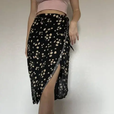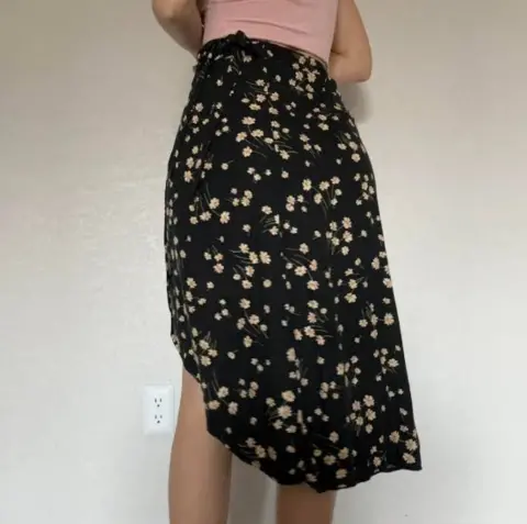 Falda American Eagle, tela suave y no transparenta. Trae dos medidas para abrochar con botón y cintas para hacer un moñito coqueto.Talla s no trae detalles, salvo que le quité la etiqueta interna porque picaba.
