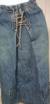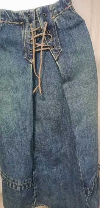 Falda en corte asimétrico de mezclilla con detalle de amarre en la parte trasera