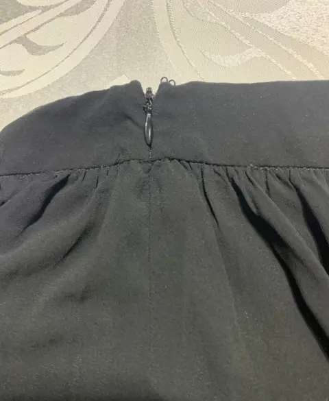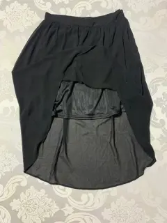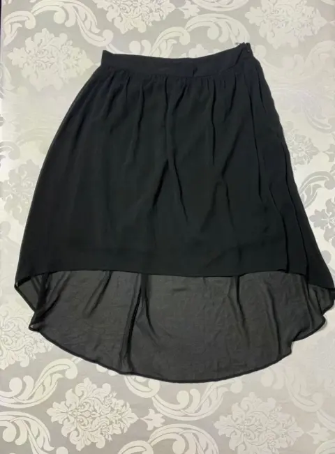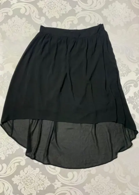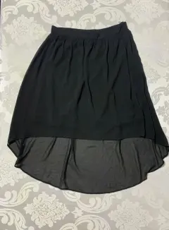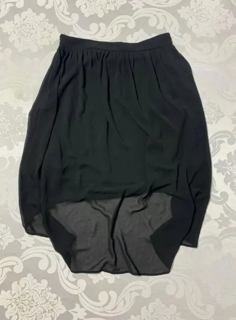 Falda ligera con forro interior, corte asimétrico, cierre oculto a un costado.Medidas/ cintura: 36 cm, cadera: 65 cm, largo frontal: 49 cm, largo trasero: 79 cm.