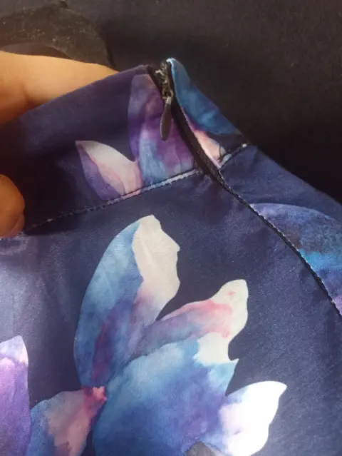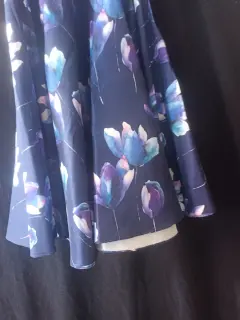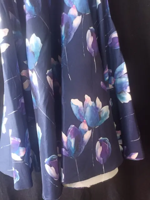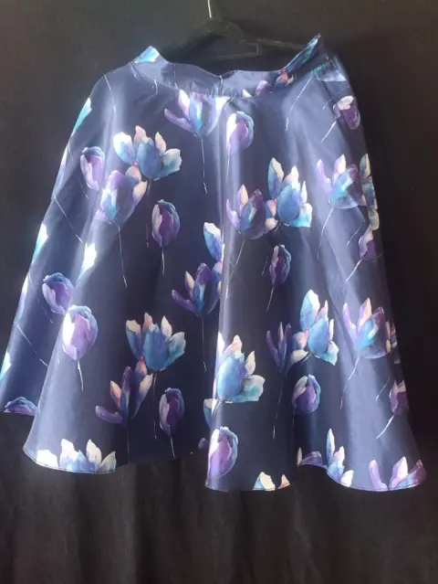 Falda azúl circular. Falda azúl con flores, corte amplio (circular) a la cintura medidas 76 cm cintura, cierre lateral.