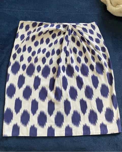Falda beige con motas moradas. Falda muy bonita ajusta en la cadera, estira poco, tiene un fruncido al frente que hace muy bonita figura a la altura de las caderas, con forro, cintura 80, cadera 98, largo 51