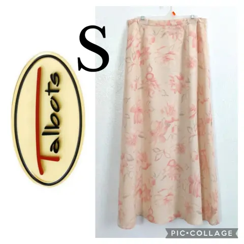 Falda beige larga floral. Color beige con estampado, tela poliéster, de hermosa caida, tiene forro.No tiene strech.Talla 2 queda bien a XS y S.Cintura: 34 cmLargo: 84 cm.Sin detalles