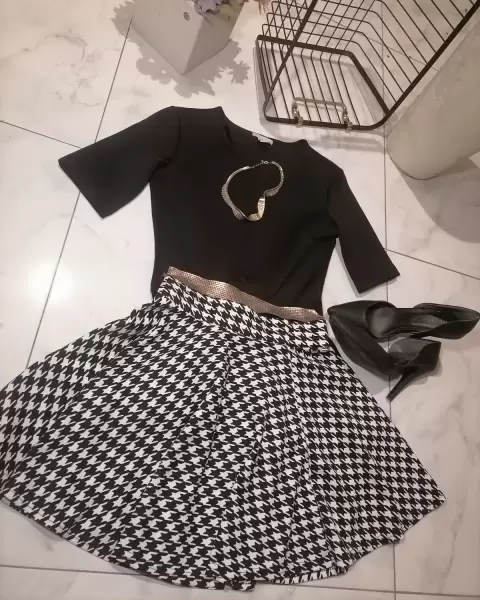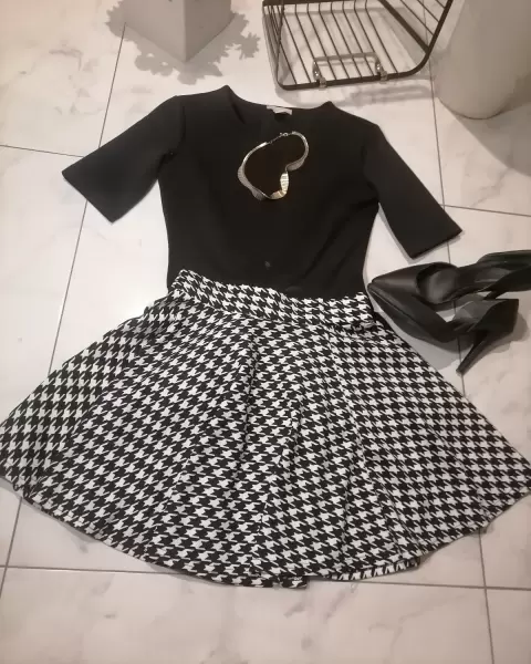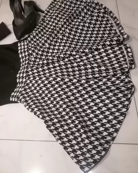 Falda circular estampado pata de gallo talla CH, marca SHEIN único detalle no trae su etiqueta, así me llegó. Foto 1 de referencia no es la misma es solo una idea de como se puede usar