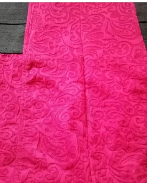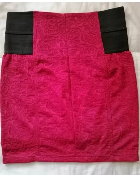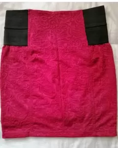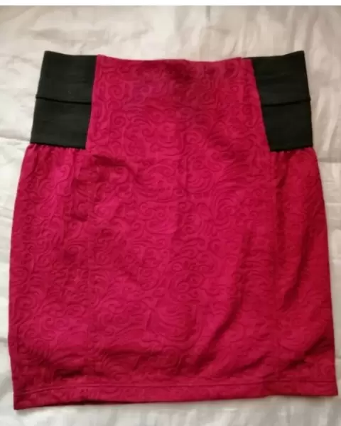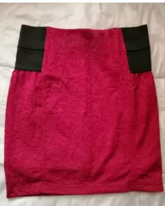 Falda color vino la tela esta texturizada en bellas formas de flores, queda pegadita y hace bonita figura, la tela estira es como de licra y en la cintura tiene resorte