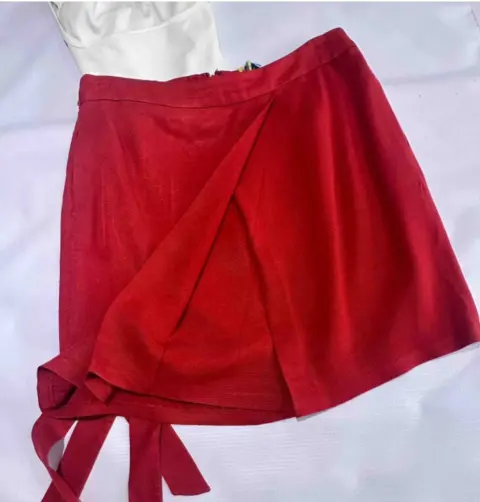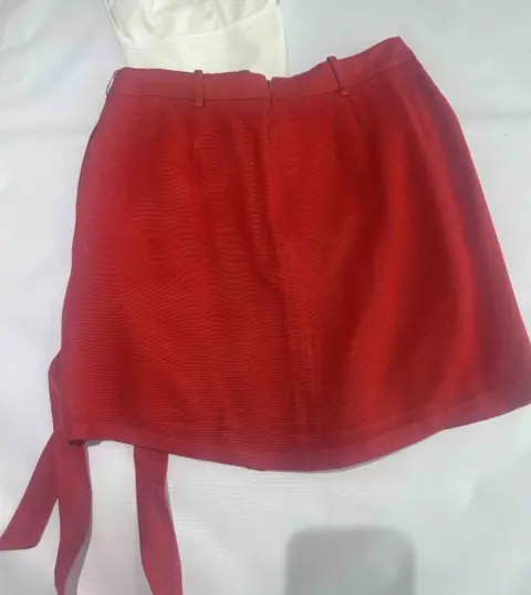 Reestrena está hermosa falta que por el color luce muy bien en esta primavera. La puedes combinar con colores neutros o estampados. Tiene un poco de bolitas como se muestra en la foto. La talla en la marca es SMedidas:Cintura 39 cmLargo 45 cm