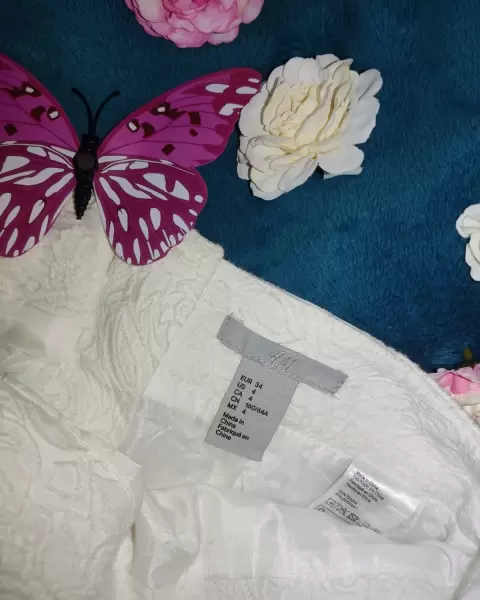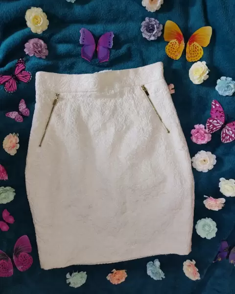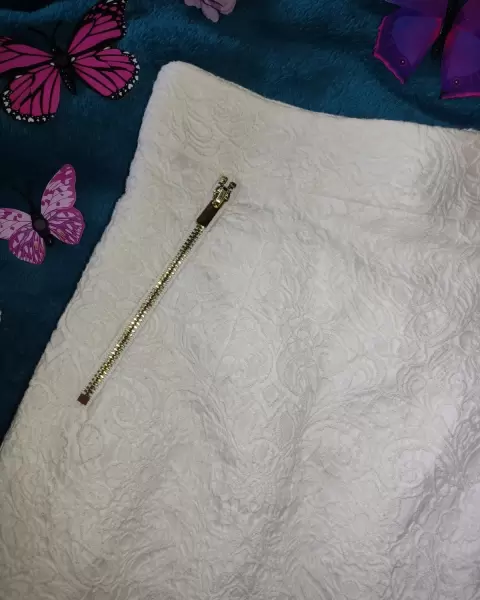 Hermosísima Falda corta con grabado cremita, con cierres dorados al frente y atrás, marca H&M, talla 4 (chica) 67 porciento algodón, 32 polyester, 1 elastano. Súper elegante.