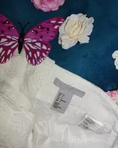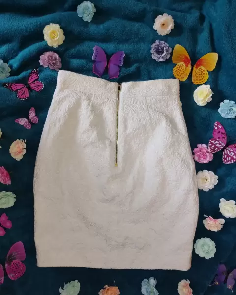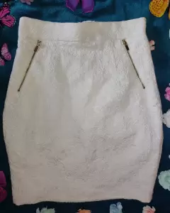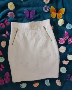 Falda corta con grabado cremita. Hermosísima Falda corta con grabado cremita, con cierres dorados al frente y atrás, marca H&M, talla 4 (chica) 67 porciento algodón, 32 polyester, 1 elastano. Súper elegante.