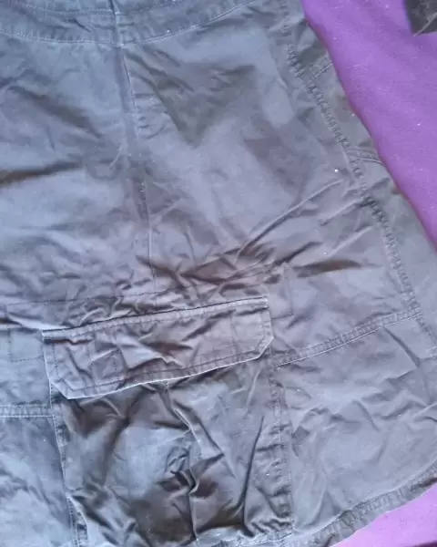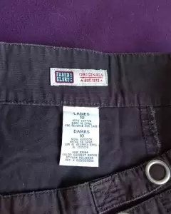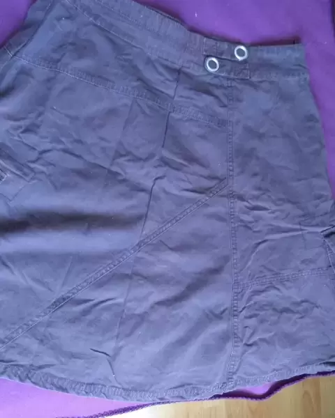 La falda tiene una bolsa en cada costado, de largo es apenas abajo de la rodilla, la tela es tipo gabardina pero suave.