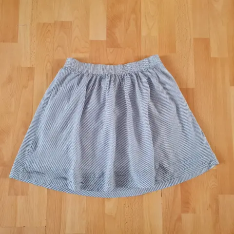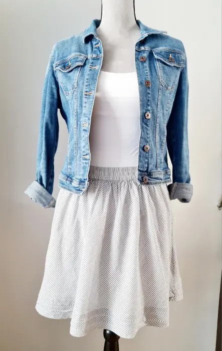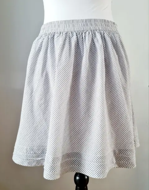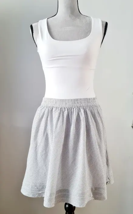 Falda corte A rayas XS/S. Falda corte A con vuelo, tiene fondo, dice en etiqueta XS pero también quedaría a una S, sin detalles.Cintura con resorte: 35 cm a 44 cmLargo: 50 cm