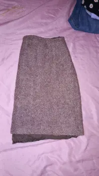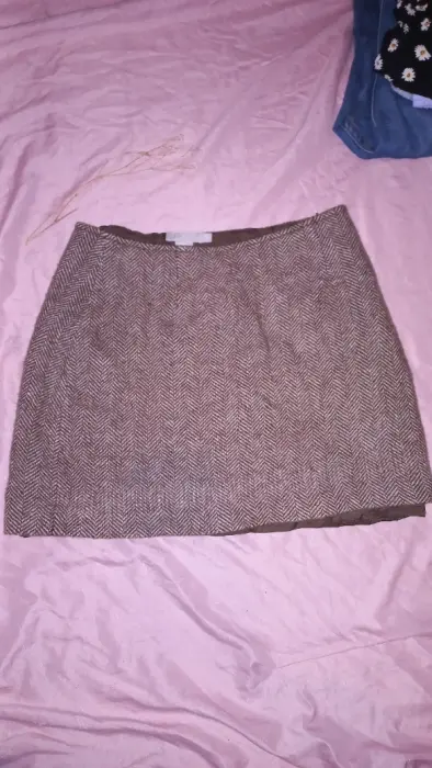 Falda cortita café. Talla S (5), perfecta para ocasiones formales, invernal, con fon y líneas blancas.