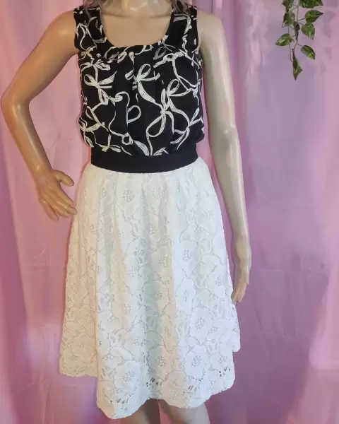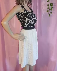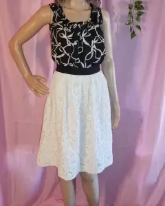 Falda en corte A, color crema y en cintura negro, tiene cierre por atrás, talla extra chica, la tela tiene un hermoso grabado con flores como lo muestro en foto y tiene fondo para que no se transparente.Envío todos los días de lunes a sábado.