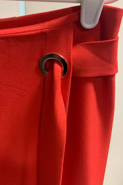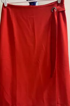 Falda midi traslapada con detalle en metal en la cintura de crepe (poliéster). Ideal para un outfit de trabajo. 68cm largo y 88cm cintura.