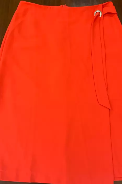 Falda cruzada con detalle en metal L. Falda midi traslapada con detalle en metal en la cintura de crepe (poliéster). Ideal para un outfit de trabajo. 68cm largo y 88cm cintura.
