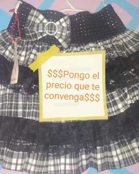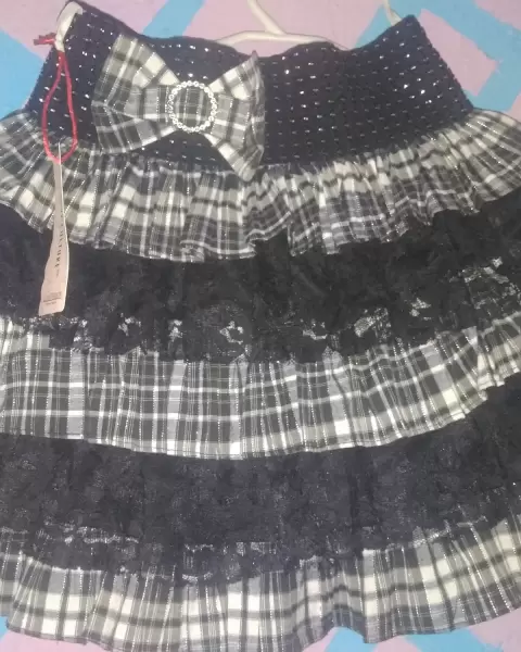 Falda cuadros negra. Es nueva, resorte ancho en la cintura con un adorno de moño. Olanes con encaje