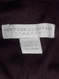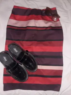 Falda tipo lápiz, con rayas y colores rojos oscuros y morado, es de corte largo con una abertura trasera