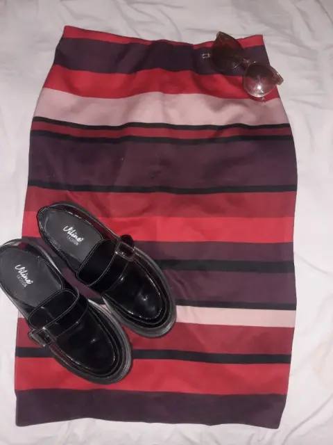 Falda de colores tipo lápiz. Falda tipo lápiz, con rayas y colores rojos oscuros y morado, es de corte largo con una abertura trasera