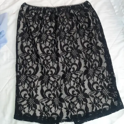Falda recta de encaje negro con forro blanco, llega abajo de la rodilla, talla 36, con resorte en la cintura