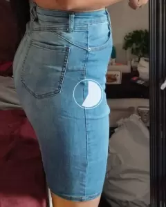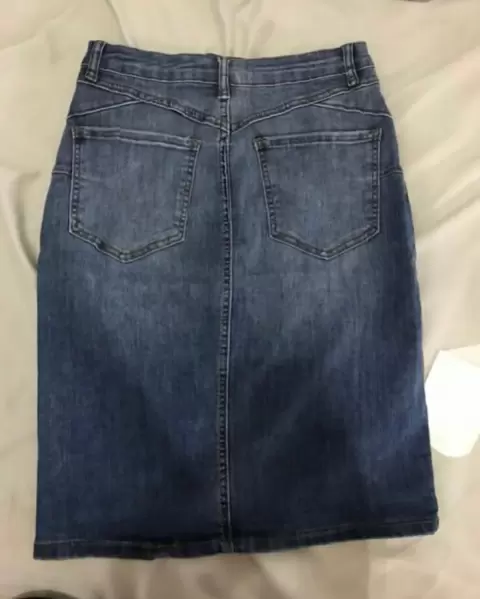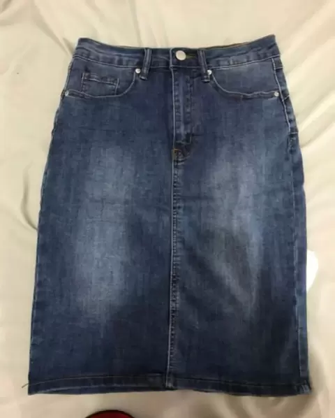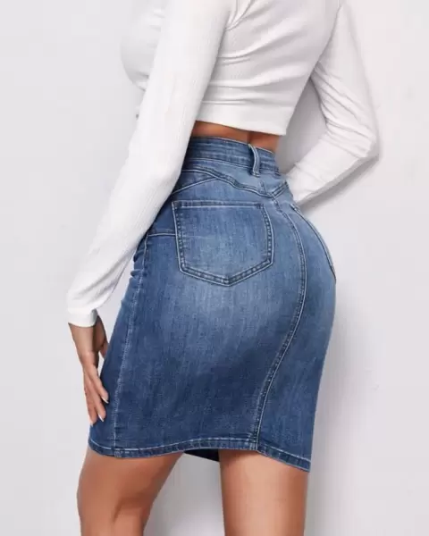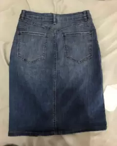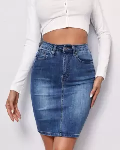 Falda de mezclilla ajustada color azul. La tela es strech y amolda muy bien al cuerpo. Tiene bolsas delanteras