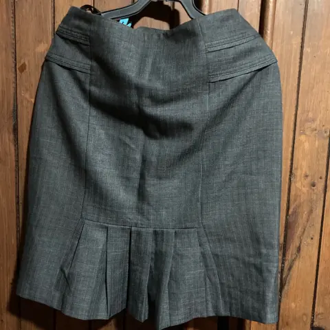 Falda de vestir color gris, queda a talla M o G, arriba de la rodilla con olanes en la parte de abajo.