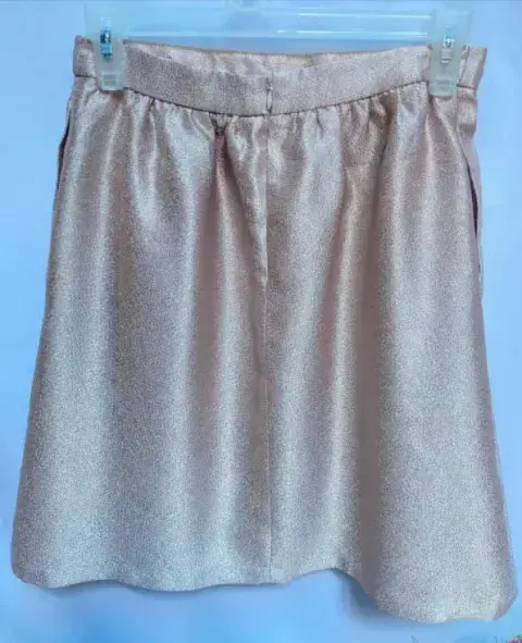 Falda en tela poliéster metálica de color rosa oro pálido. Pretina y cierre invisible en la parte de atrás fruncido en la cintura. Tipo de corte en la falda en línea “A”. Bolsas en los costados de la falda.
