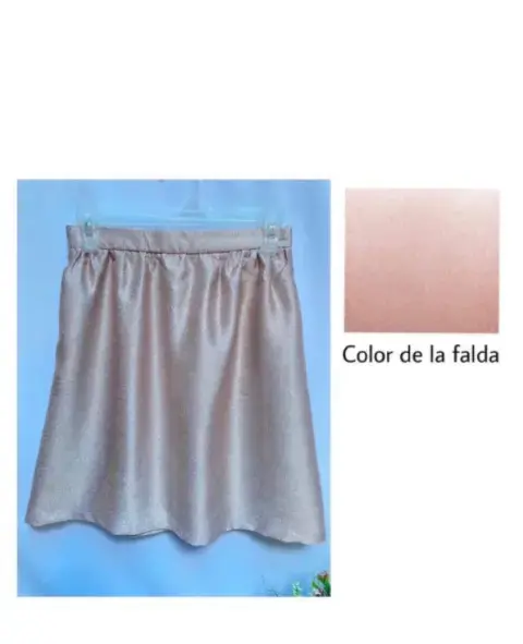 Falda en tela poliéster metálica de color rosa. Falda en tela poliéster metálica de color rosa oro pálido. Pretina y cierre invisible en la parte de atrás fruncido en la cintura. Tipo de corte en la falda en línea “A”. Bolsas en los costados de la falda.