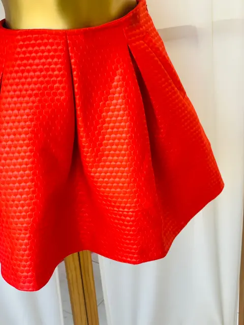 Falda estilo globo vinil piel rojo S. Descubre la elegancia audaz con esta falda roja estilo globo de vinil piel. Esta pieza única destaca por su diseño volumétrico que aporta un toque de sofisticación a cualquier look. Fabricada en vinil de alta calidad que imita la textura de la piel, la falda ofrece un acabado brillante y moderno que capta todas las miradas. Talla S