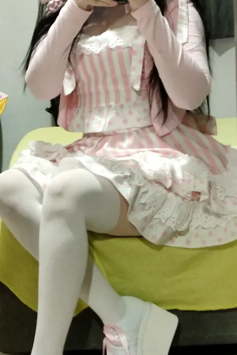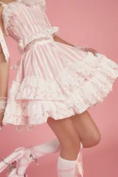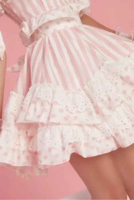 Falda estilo Lolita con olanes. Esta minifalda tiene un ajuste de cintura alta, un diseño de rayas verticales, ribete estampado de lunares, volantes de encaje con ojales en capas y cierres de cremallera y listón en la parte posterior.