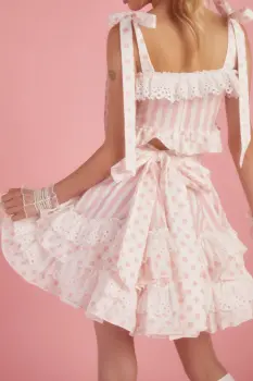 Esta minifalda tiene un ajuste de cintura alta, un diseño de rayas verticales, ribete estampado de lunares, volantes de encaje con ojales en capas y cierres de cremallera y listón en la parte posterior.