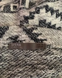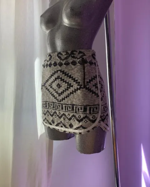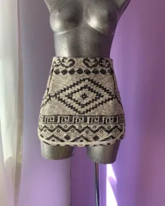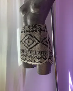 Falda de tela, beige con grecas negras talla chica. Está hermosa. Sus medidas son: 34cm de largo total y 74cm de cintura.