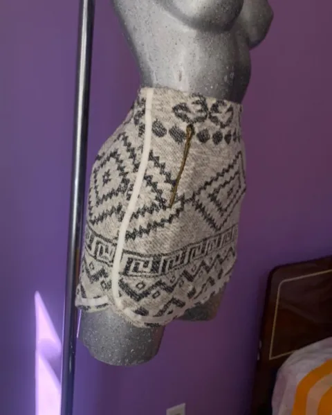 Falda grecas. Falda de tela, beige con grecas negras talla chica. Está hermosa. Sus medidas son: 34cm de largo total y 74cm de cintura.