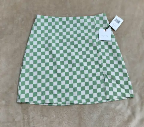Falda juvenil a cuadros. Se super fashion y diferente. Hermosa falda a cuadros color verde y crema con abertura pequeña en pierna. Dice M pero viene reducido a S. Cintura 35 CM al frente Cadera 44 cmLargo 40 cm