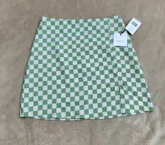 Se super fashion y diferente. Hermosa falda a cuadros color verde y crema con abertura pequeña en pierna. Dice M pero viene reducido a S. Cintura 35 CM al frente Cadera 44 cmLargo 40 cm