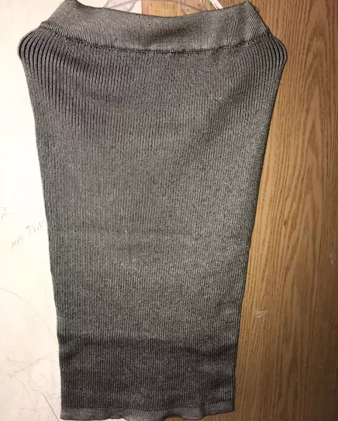 Falda “lápiz” brillosa. Falda de Licra en corte lápiz llega abajo de la rodilla y tiene elástico en la parte de la cintura es color entre gris y dorado :)