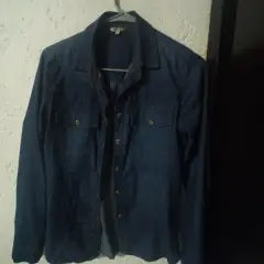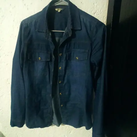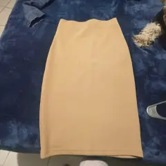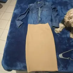 Falda lápiz con camisa. Falda beige,.llega abajo de la rodilla. Va con camisa de mezclilla, sin detalles