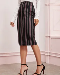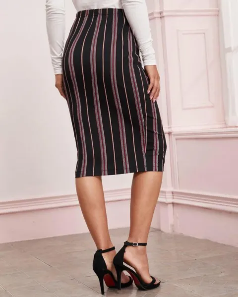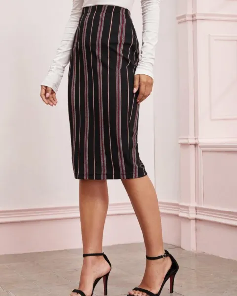 Falda lápiz de rayas Shein. Esta falda lápiz es de esas cosas que no te pueden faltar en tu clóset, está falda es elegante para esos días en los que quieres traer un outfit muy casual y ejecutivo.