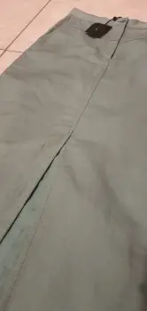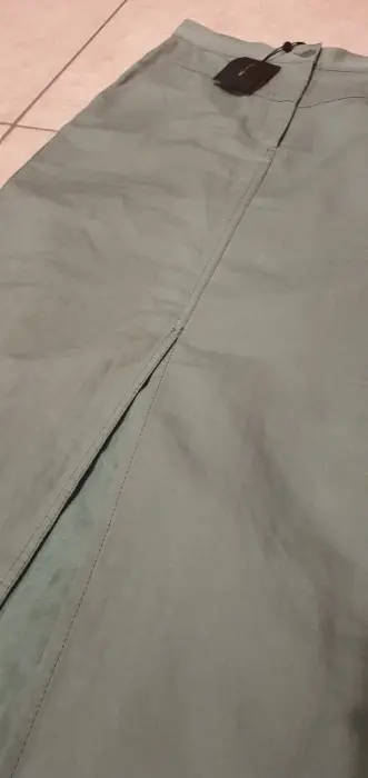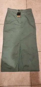Falda color verde claro, es larga y tiene abertura en la parte de enfrente. Tiene bolsas a los lados. Es de tiro muy alto. Viene marcada como talla XS pero creo que queda mejor a una S, viene amplia. Nueva y con etiqueta