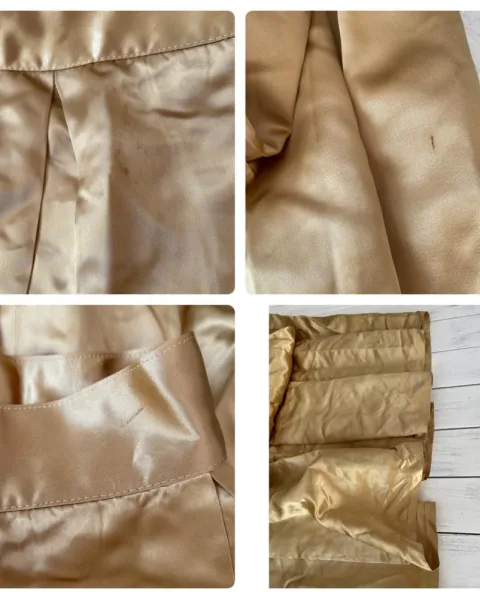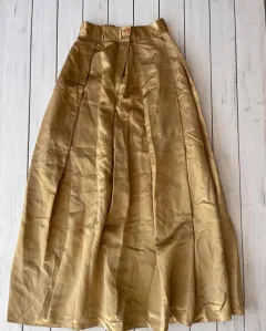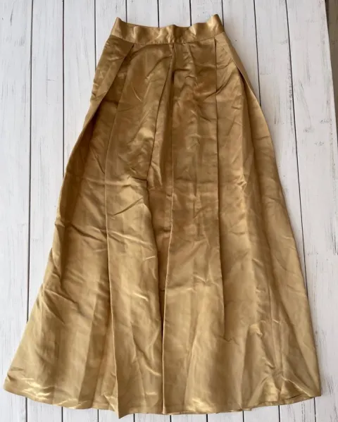Falda plisada larga, satinada, dorada, a la cintura.Medidas: 33.5 cm de cintura, no tiene resorte más se podrían recorrer los botones un par de centímetros. Largo: 106 cm aproximadamente. No tiene bolsillos laterales. Cierra con dos botones y tiene cierre. Tiene marcas de eso estéticas, nada funcional.