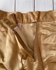 Falda larga satinada dorada. Falda plisada larga, satinada, dorada, a la cintura.Medidas: 33.5 cm de cintura, no tiene resorte más se podrían recorrer los botones un par de centímetros. Largo: 106 cm aproximadamente. No tiene bolsillos laterales. Cierra con dos botones y tiene cierre. Tiene marcas de eso estéticas, nada funcional.